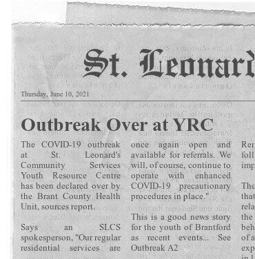 Brantford, ON - June 10, 2021 The COVID-19 outbreak that had been declared at the St. Leonard's Community Services Youth Resource Centre has now been been confirmed to be over by the Brant County Health Unit. Our regular residential services are once again open and available for referrals. Of course, St. Leonard's Community Services will continue to operate with enhanced COVID-19 precautionary procedures in place.